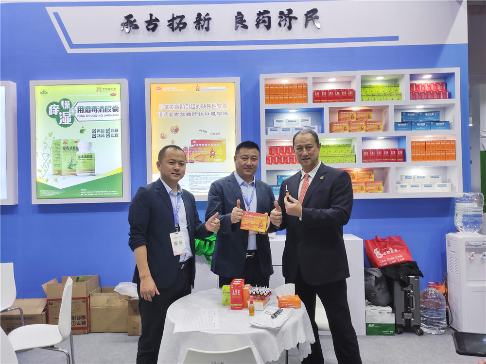 ▲ 圖 | 毛里求斯駐華大使王純?nèi)f蒞臨康臣玉林制藥展位深入了解并試飲源力康®產(chǎn)品