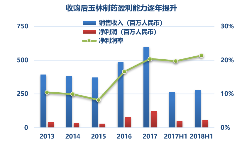 自2016年7月收購(gòu)玉林制藥至今經(jīng)營(yíng)情況持續(xù)改善,凈利率從不到10%逐步提升到進(jìn)20%,上半年凈利率提高到21.3%的水平,體現(xiàn)出康臣在并購(gòu)及投后管理方面的能力。