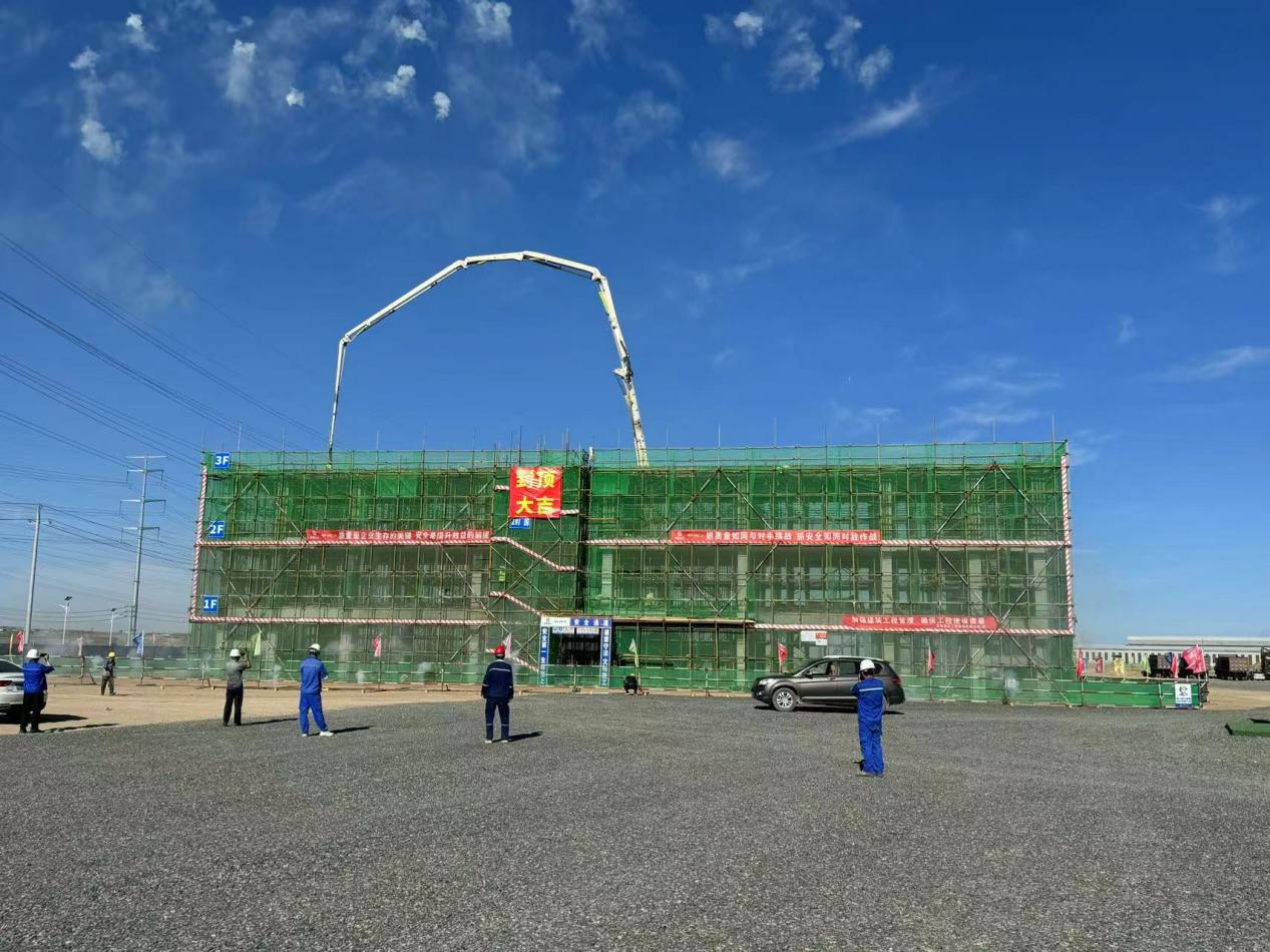 此次封頂?shù)?#標(biāo)準(zhǔn)化廠房,長(zhǎng)49.45米,寬108米,高13.45米,建筑面積11193平方米,其中主廠房為2層鋼結(jié)構(gòu),一層高為6.3米,二層高為7.15米。輔助用房為3層混凝土框架結(jié)構(gòu),一層高為4.45米,二 層高為4.42米,三層高為4.8米。2#標(biāo)準(zhǔn)化廠房輔助用房7月11日一層澆筑完成,7月19日二層澆筑完成,7月29日喜封金頂。