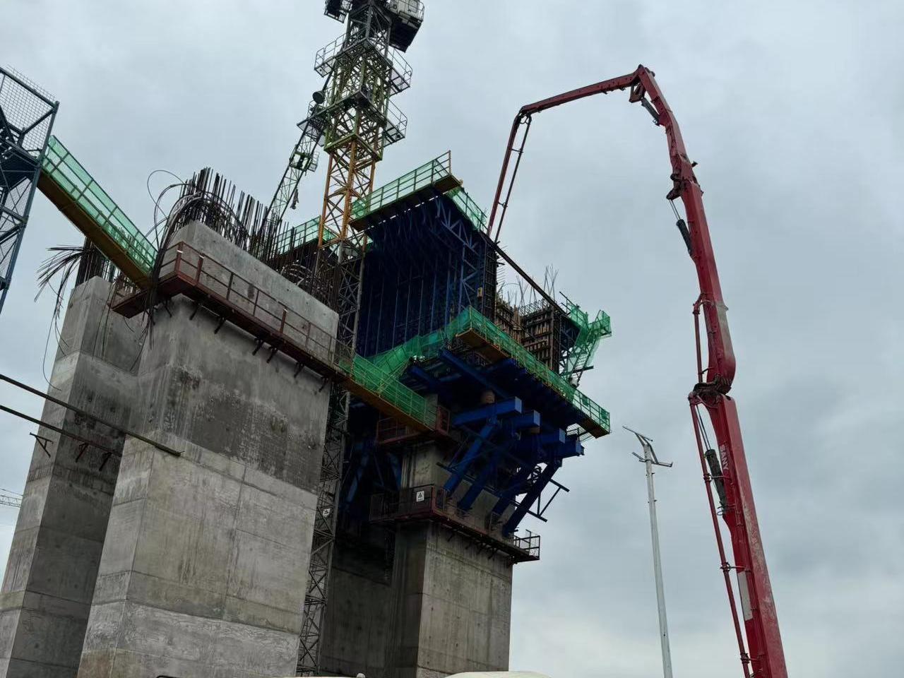 該0#塊箱梁,長12米,頂板寬達12.75米,底板寬度為6.75米,腹板80厘米,整塊梁段重達983.6噸。澆筑前,項目部制定了周密的施工計劃,由于0#塊鋼筋、鋼絞線密集,混凝土澆筑高度大,為確?;炷翝仓|量,澆筑過程中,項目部依照“豎向分段、水平分層”的澆筑原則,遵循先底板、再腹板對稱、最后頂板的澆筑順序,嚴格遵循了托上現(xiàn)澆的施工工藝。1臺泵車連續(xù)澆筑,1臺泵車備用,采用水平分層的工藝,前后兩層混凝土的間隔時間不超過1小時。底板澆筑時,縱橋向先澆筑墩頂中橫梁部位,再逐漸由兩端向墩頂水平分層進行,橫橋向為兩側腹板向連續(xù)梁中間方向對稱均衡進行;腹板澆筑時,按縱向水平分層澆筑,分層厚度為30厘米,橫橋向各腹板左右相互交替連續(xù)澆筑,如此循環(huán),直至腹板混凝土澆筑完畢;頂板澆筑時,縱橋向從懸臂端部向根部進行,橫橋向為由低到高從懸臂端向根部進行。歷時10個小時,項目建設團隊依次進行托架的搭設與底模的安裝,托架預壓和底模調整,鋼筋綁扎、模板安裝等工序,確保了工程的穩(wěn)固與安全。最后,經(jīng)過混凝土澆筑、養(yǎng)護以及預應力施工的精細操作,圓滿完成了0#塊箱梁的澆筑工作。