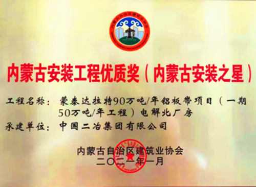 近日,由中國二冶鋼構(gòu)分公司施工的蒙泰達(dá)拉特鋁板帶項目(一期50萬噸電解鋁工程),被內(nèi)蒙古自治區(qū)建筑業(yè)協(xié)會評選為內(nèi)蒙古安裝工程優(yōu)質(zhì)獎(內(nèi)蒙古安裝之星)。
