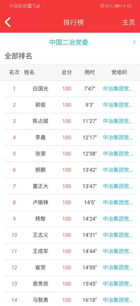 本次黨史知識競賽,內(nèi)容涵蓋了習(xí)近平《論中國共產(chǎn)黨歷史》、《毛澤東、鄧小平、江澤民、胡錦濤關(guān)于中國共產(chǎn)黨歷史論述摘編》、《習(xí)近平新時代中國特色社會主義思想學(xué)習(xí)問答》、《中國共產(chǎn)黨簡史》等黨史內(nèi)容。競賽依托五礦智慧黨建app平臺進(jìn)行,競賽共300道試題,包括單項選擇、多項選擇。在競賽時間內(nèi)可以隨時參與答題。后臺會根據(jù)答題的正確率由高到低進(jìn)行排列,正確率相同的,將已答題用時進(jìn)行排序。在答題競賽中,每位黨員積極思考,認(rèn)真答題,踴躍參與,不少黨員紛紛表示,通過這個知識競賽,使黨史、黨章、黨規(guī)都印在腦海里,理解也深刻。希望公司今后能多舉辦類似活動,提升黨員政治理論知識與黨員思想覺悟能力,爭做優(yōu)秀共產(chǎn)黨員。本次黨史知識競賽活動,公司共有1560名黨員干部踴躍參加,經(jīng)過激烈角逐,來自四川分公司的白國光以7分47秒的優(yōu)異成績?nèi)〉脻M分,獲得本次競賽活動的一等獎;來自市政分公司的郭俊等5名黨員獲得二等獎;來自華東分公司的王成軍等10名黨員獲得三等獎;來自甘肅分公司的高國義等30名黨員獲得優(yōu)秀獎。