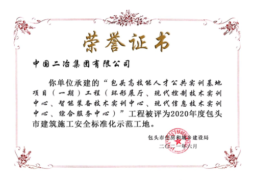 近日,從包頭市安監(jiān)站獲悉,中國二冶城建分公司實訓基地項目被內蒙古自治區(qū)包頭市住房和城鄉(xiāng)建設局評為2020年度包頭市建筑施工安全標準化示范工地。