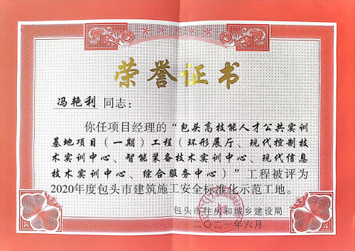 實訓基地項目先后獲評中冶安全文明標準化工地、內蒙古綠色建筑工地、“中施企協(xié)綠色建造評價”二星等多個安全文明類獎項,同時在2020年7月份組織的中國二冶集團內蒙古自治區(qū)片區(qū)“安全文明標準化”觀摩活動中獲得當?shù)卣c集團公司的一致好評。