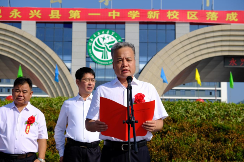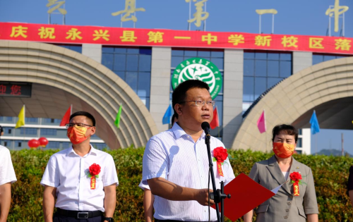 揭牌儀式首先由永興一中校長(zhǎng)胡兆文致辭。他指出,永興一中項(xiàng)目建設(shè)是造福當(dāng)?shù)匕傩盏囊豁?xiàng)重大民生工程,是功在當(dāng)代,利在千秋的一件大事。他希望學(xué)生們心懷天下做有家國(guó)情懷的人,意志堅(jiān)韌做積極進(jìn)取的人,心胸開(kāi)闊做陽(yáng)光大度的人,心存善意做助人為樂(lè)的人。最后,他祝學(xué)生們?cè)谛碌膶W(xué)校快樂(lè)成長(zhǎng)。