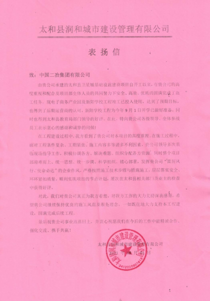 中國(guó)二冶收到太和城市建設(shè)管理公司表?yè)P(yáng)信
