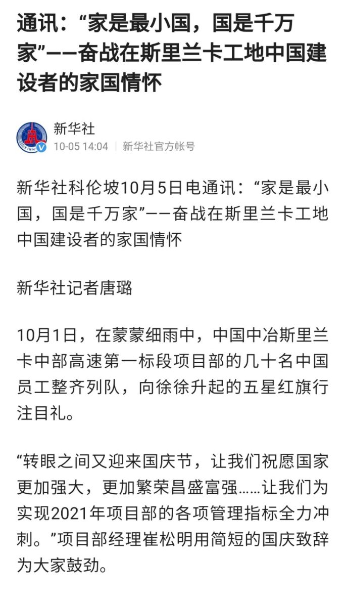 10月5日,新華社以《“家是最小國,國是千萬家”——奮戰(zhàn)在斯里蘭卡工地中國建設(shè)者的家國情懷》為題對中國中冶斯里蘭卡中部高速第一標(biāo)段項(xiàng)目部進(jìn)行特別報(bào)道。項(xiàng)目工作人員在采訪中表示,“家是最小國,國是千萬家”,作為在海外參與“一帶一路”項(xiàng)目的建設(shè)者,我們懷有一種使命感和責(zé)任感,盡管有時(shí)需要為此作出個(gè)人犧牲。當(dāng)看到通過自己的努力,斯里蘭卡基礎(chǔ)設(shè)施日新月異、旅游業(yè)蓬勃發(fā)展,我們感到由衷高興和自豪。
