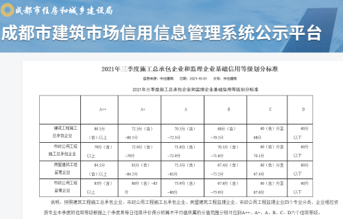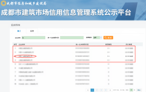 10月8日,成都市建筑市場信用信息管理系統(tǒng)公示平臺數(shù)據(jù)顯示,中國二冶在成都地區(qū)信用等級二、三季度蟬聯(lián)A++。進(jìn)一步樹立起了中國二冶在蜀良好的誠信品牌形象。