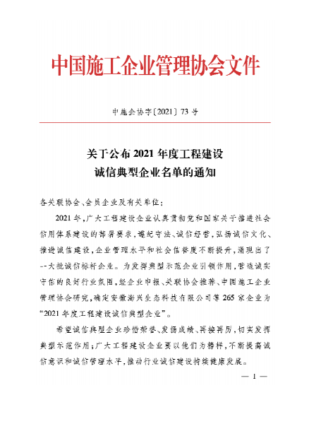 10月28日,由中國(guó)施工企業(yè)管理協(xié)會(huì)主辦的2021年度工程建設(shè)企業(yè)信用評(píng)價(jià)結(jié)果及誠(chéng)信企業(yè)評(píng)選揭曉,中國(guó)二冶通過(guò)AAA信用等級(jí)年審并被授予“2021年度工程建設(shè)誠(chéng)信典型企業(yè)”。