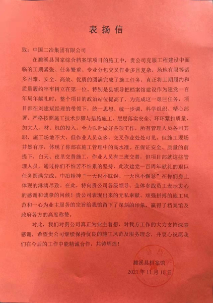 11月10日,濉溪縣檔案館致中國二冶表揚信,對中國二在濉溪國家檔案館EPC總承包項目建設中,克服工程建設工期緊張、任務繁重、專業(yè)交叉作業(yè)多、場地有限等諸多困難,安全、優(yōu)質(zhì)、高效地圓滿完成施工任務給予表揚。
