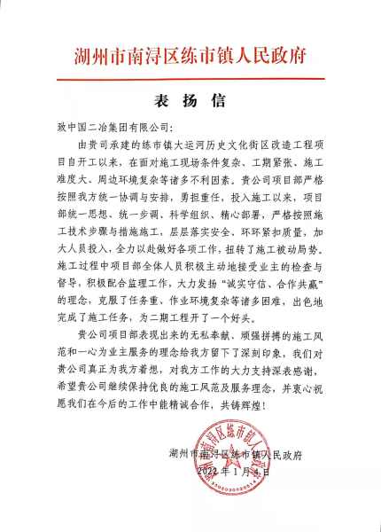 1月4日,湖州市南潯區(qū)練市鎮(zhèn)人民政府致中國(guó)二冶表?yè)P(yáng)信,對(duì)中國(guó)二冶路橋分公司大運(yùn)河項(xiàng)目部無(wú)私奉獻(xiàn)、頑強(qiáng)拼搏的施工風(fēng)范和一心為業(yè)主服務(wù)的理念表示感謝。