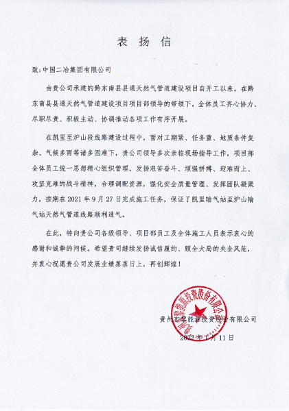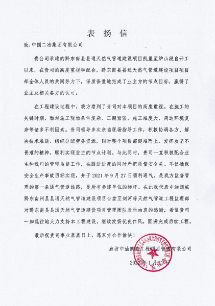 貴州東黎投資股份有限公司在表揚(yáng)信中指出,在凱里至爐山段線路建設(shè)過程中,面對(duì)工期緊、任務(wù)重、地質(zhì)條件復(fù)雜、氣候多雨等諸多困難下,中國二冶領(lǐng)導(dǎo)多次親臨現(xiàn)場(chǎng)指導(dǎo)工作,項(xiàng)目部全體員工統(tǒng)一思想精細(xì)組織管理,合理調(diào)配資源,強(qiáng)化安全質(zhì)量管理、發(fā)揮團(tuán)隊(duì)凝聚力,按照計(jì)劃節(jié)點(diǎn)日期完成施工任務(wù),保證了凱里輸氣站至爐山輸氣站天然氣管道線路順利通氣,在此向中國二冶表示衷心的感謝和誠摯的問候。同時(shí),希望中國二冶繼續(xù)發(fā)揚(yáng)誠信履約、顧全大局的央企風(fēng)范,與我方實(shí)現(xiàn)合作共贏,圓滿完成施工任務(wù)。