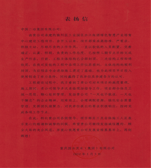 重慶園業(yè)實(shí)業(yè)(集團(tuán))有限公司在表揚(yáng)信中指出,中國二冶南川區(qū)工業(yè)園區(qū)水江組團(tuán)綠色智慧產(chǎn)業(yè)培育中心建設(shè)工程項(xiàng)目自開工以來,項(xiàng)目經(jīng)理部秉承高標(biāo)準(zhǔn)、嚴(yán)要求、積極主動(dòng)、盡職盡責(zé)的工作作風(fēng),如期完成建設(shè)方下達(dá)的工程進(jìn)度目標(biāo),在其公司發(fā)包的眾多工程中各項(xiàng)工作位居前列。希望項(xiàng)目部能夠在接下來的施工建設(shè)工作中繼續(xù)協(xié)調(diào)各方、持續(xù)發(fā)力,推進(jìn)項(xiàng)目早日建成并投入使用,同時(shí)祝愿中國二冶集團(tuán)有限公司發(fā)展業(yè)績(jī)蒸蒸日上,再創(chuàng)輝煌。