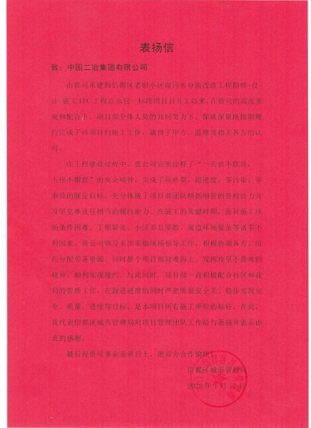 中國(guó)二冶連續(xù)收到兩封表?yè)P(yáng)信
