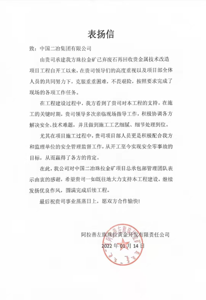 阿拉善左旗珠拉黃金開發(fā)有限責(zé)任公司在表?yè)P(yáng)信中指出,在工程施工的關(guān)鍵時(shí)期,面對(duì)施工現(xiàn)場(chǎng)條件復(fù)雜、工期緊張、施工難度大、周邊環(huán)境復(fù)雜等諸多不利因素,整個(gè)項(xiàng)目部人員都迎難而上、發(fā)揮攻堅(jiān)不畏難的精神,全力做到施工工藝細(xì)膩、細(xì)節(jié)處理到位。同時(shí),中國(guó)二冶積極配合業(yè)主及監(jiān)理單位做好管理監(jiān)督工作,在跟進(jìn)進(jìn)度的同時(shí)嚴(yán)把質(zhì)量安全關(guān),從開工至今實(shí)現(xiàn)了零事故的目標(biāo),贏得了各方的肯定,在此向中國(guó)二冶表示衷心的感謝和誠(chéng)摯的問候。同時(shí),希望中國(guó)二冶一如既往地大力支持本工程建設(shè),繼續(xù)發(fā)揚(yáng)優(yōu)良作風(fēng),圓滿完成后續(xù)工程。