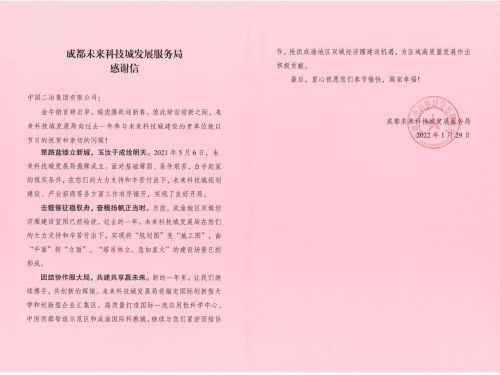 1月29日,成都未來(lái)科技城發(fā)展服務(wù)局致中國(guó)二冶感謝信,