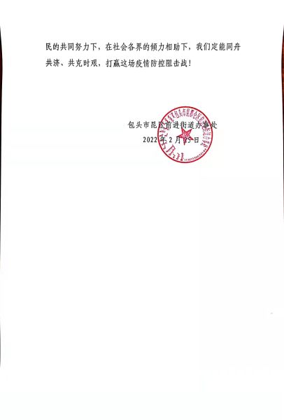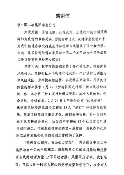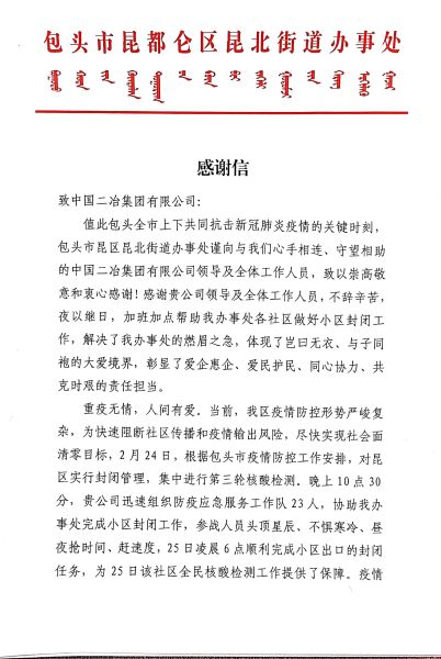2月25日,包頭市昆區(qū)前進街道辦事處、包頭市昆區(qū)街道辦事處致中國二冶感謝信。信中盛贊中國二冶在抗擊新冠病毒肺炎疫情的緊要關(guān)頭,攜手相助,迎難而上,彰顯了中國二冶愛民護民、同心協(xié)力、共克時艱的央企擔(dān)當(dāng),特向中國二冶集團干部職工致以崇高敬意和衷心感謝!