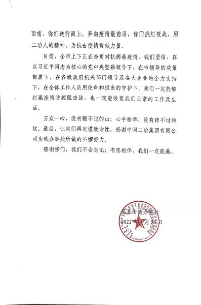感謝信中寫道,值此包頭全市上下共同抗擊新冠肺炎疫情的關(guān)鍵時刻,中國二冶冶金公司第一時間奔赴昆區(qū)前進街道辦事處、昆北街道辦事處,協(xié)助對所管轄的22個社區(qū)進出口進行封閉施工。連續(xù)奮戰(zhàn)不休息,頭頂星辰、不懼寒冷、晝夜搶時間、趕速度、要效率,幫助辦事處解決了燃眉之急,構(gòu)筑起疫情防控的第一道防線,順利完成所有小區(qū)的封閉任務(wù),為第三次全民核酸檢測工作提供了有利的保障。疫情面前,你們逆行而上,奔向疫情最前沿,你們挑燈夜戰(zhàn),用二冶人的精神詮釋央企的責(zé)任與擔(dān)當(dāng)。再次感謝中國二冶集團冶金分公司的干部職工,用顆顆愛心匯聚成打贏這場疫情阻擊戰(zhàn)的磅礴力量!上下同欲者勝,風(fēng)雨同舟者興。