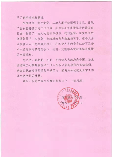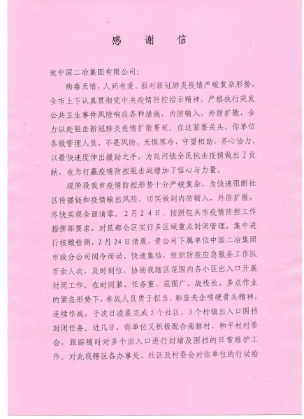 3月2日,昆河鎮(zhèn)人民政府向中國二冶發(fā)來感謝信,對中國二冶在全市全力阻擊新冠肺炎疫情擴(kuò)散蔓延的緊要關(guān)頭,不畏風(fēng)險(xiǎn),無懼寒冷,守望相助,齊心協(xié)力,以最快速度為昆河鎮(zhèn)快速阻斷社區(qū)傳播鏈和疫情輸出風(fēng)險(xiǎn)所做出的貢獻(xiàn),對央企快速反應(yīng)、雷厲風(fēng)行的工作作風(fēng)表示感謝。