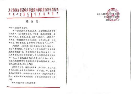 中國(guó)二冶收到達(dá)拉特旗疫情防控指揮部錦旗和感謝信