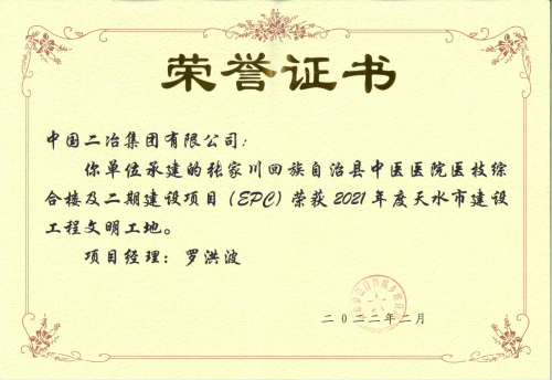3月20日,中國二冶張家川縣中醫(yī)醫(yī)院遷建工程項目部收到甘肅省天水市2021年度建設工程文明工地榮譽證書。