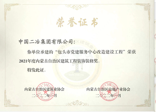 4月11日,中國(guó)二冶收到內(nèi)蒙古自治區(qū)建筑協(xié)會(huì)、內(nèi)蒙古自治區(qū)房地產(chǎn)協(xié)會(huì)發(fā)來(lái)的榮譽(yù)證書(shū)——中國(guó)二承建的包頭市黨建服務(wù)中心改造項(xiàng)目建設(shè)工程榮獲2021年度內(nèi)蒙古自治區(qū)建筑工程裝飾裝修獎(jiǎng)。