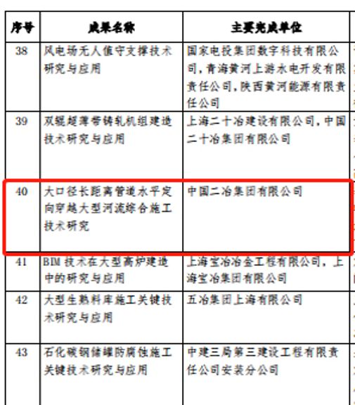 4月12日,中國(guó)安裝協(xié)會(huì)公布《關(guān)于公布2022年中國(guó)安裝協(xié)會(huì)科學(xué)技術(shù)進(jìn)步獎(jiǎng)評(píng)選結(jié)果的通知》的正式文件。中國(guó)二冶申報(bào)的《大口徑長(zhǎng)距離管道水平定向穿越大型河流綜合施工技術(shù)研究》首次斬獲中國(guó)安裝協(xié)會(huì)科學(xué)進(jìn)步獎(jiǎng)二等獎(jiǎng)。