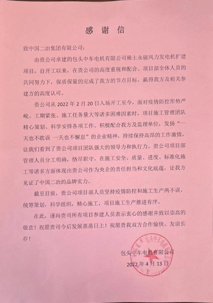 4月13日,中國(guó)二冶收到來(lái)自包頭中車電機(jī)有限公司感謝信,對(duì)中國(guó)二冶在包頭中車稀土永磁風(fēng)力發(fā)電機(jī)擴(kuò)建項(xiàng)目工程取得的成績(jī)表示肯定,對(duì)中國(guó)二冶參與項(xiàng)目工程建設(shè)全體人員兢兢業(yè)業(yè)、敢打敢拼的奮斗精神予以肯定,對(duì)在疫情形勢(shì)下保障該項(xiàng)目施工節(jié)點(diǎn)所做出的卓越貢獻(xiàn)表示感謝。