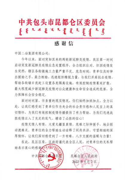 同心抗疫 共克時(shí)艱——中國(guó)二冶收到包頭市昆區(qū)區(qū)委、區(qū)政府感謝信