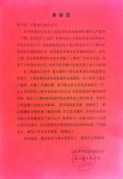 5月17日,中國二冶收到山東永寧藥業(yè)有限公司發(fā)來的感謝信,信中贊揚(yáng)中國二冶在山東永寧藥業(yè)項(xiàng)目建設(shè)過程中,實(shí)干擔(dān)當(dāng)、迎難而上、精心部署,努力克服工期緊、任務(wù)重等不利因素,在復(fù)雜嚴(yán)峻的疫情形勢下,保證材料供應(yīng)和人員補(bǔ)充,嚴(yán)把質(zhì)量關(guān),打造精品工程,充分展現(xiàn)出央企的責(zé)任與擔(dān)當(dāng)。