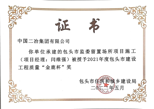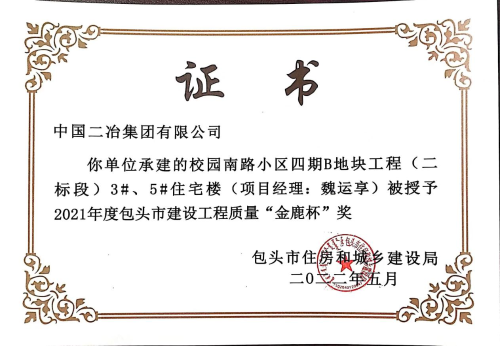 6月1日,中國(guó)二冶收到包頭市建筑業(yè)協(xié)會(huì)頒發(fā)的榮譽(yù)證書,中國(guó)二冶金力永磁 (包頭)科技有限公司高性能稀土永磁材料基地、包頭市監(jiān)委留置場(chǎng)所、校園南路小區(qū)四期B地塊工程(二標(biāo)段)3#、5#住宅樓三項(xiàng)工程喜獲2021年度包頭市“金鹿杯”工程質(zhì)量獎(jiǎng)。