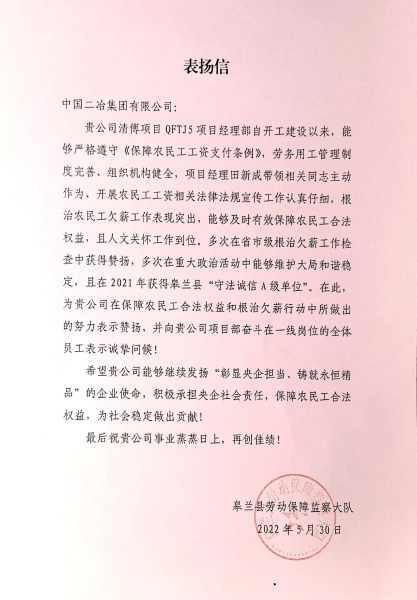 5月31日,中國二冶收到蘭州市皋蘭縣勞動保障監(jiān)察大隊表揚信,對中國二冶清傅項目部勞務用工實名制管理工作給予高度贊揚和肯定。