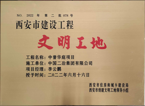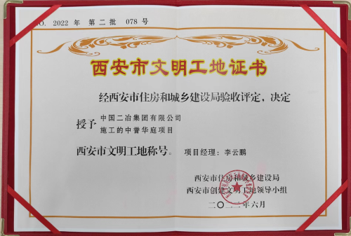 7月5日,中國二冶收到西安市住房和城鄉(xiāng)建設(shè)局頒發(fā)的榮譽(yù)證書及獎(jiǎng)牌,由中國二冶承建的中譽(yù)華庭項(xiàng)目榮獲西安市“文明工地”榮譽(yù)稱號。