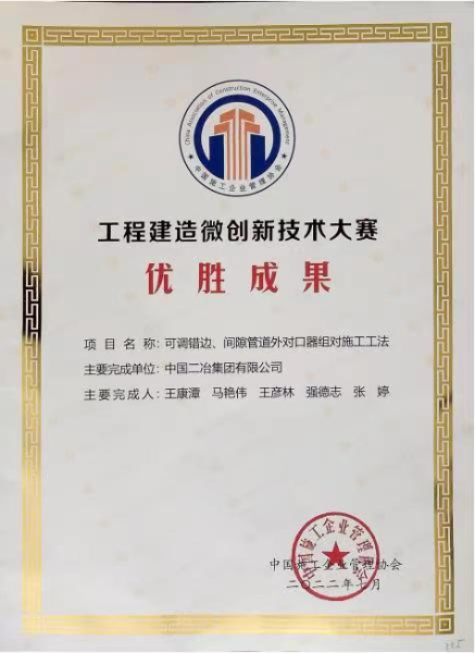7月29日-30日,由中國施工企業(yè)管理協(xié)會(huì)主辦的2022年工程建設(shè)行業(yè)科技工作會(huì)議暨科技成果競賽交流會(huì)在杭州召開。會(huì)上,由中國二冶選送的“可調(diào)錯(cuò)邊、間隙管道外對口器組對施工工法”榮獲第二屆工程建造微創(chuàng)新技術(shù)大賽優(yōu)勝成果獎(jiǎng);“大口徑長輸管道大跨度整體吊裝施工方法”榮獲第二屆工程建設(shè)行業(yè)高推廣價(jià)值專利大賽三等獎(jiǎng)。