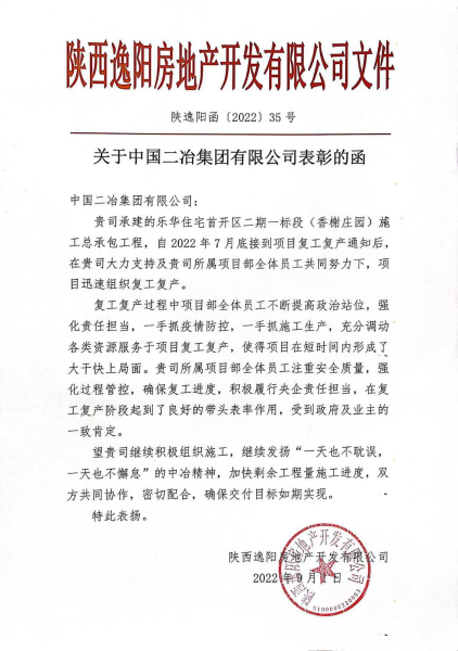 9月1日,中國(guó)二冶收到陜西逸陽房地產(chǎn)開發(fā)有限公司發(fā)來的《關(guān)于中國(guó)二冶集團(tuán)有限公司表彰的函》。表彰函充分肯定了中國(guó)二冶陜西分公司在樂華住宅首開區(qū)二期一標(biāo)段(香榭莊園)施工總承包項(xiàng)目復(fù)工復(fù)產(chǎn)以來展現(xiàn)出來的關(guān)鍵時(shí)刻頂?shù)米?,困難面前勇攀登的央企風(fēng)范。