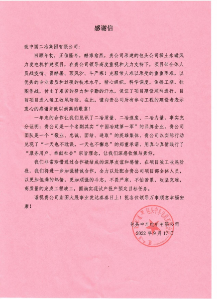 9月26日,包頭中車電機(jī)有限公司向中國(guó)二冶致表?yè)P(yáng)信,表?yè)P(yáng)中國(guó)二冶戰(zhàn)疫情、冒酷暑、頂風(fēng)沙、斗嚴(yán)寒,克服重重苦難,保證項(xiàng)目建設(shè)順利進(jìn)行的央企作為,對(duì)中國(guó)二冶承建的包頭中車項(xiàng)目順利完成各項(xiàng)工程節(jié)點(diǎn)和任務(wù)目標(biāo)表示認(rèn)可。