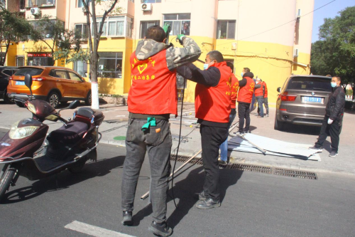 10月8日適逢二十四節(jié)氣中的“寒露”,包頭地區(qū)氣溫驟降十幾度,分公司機(jī)關(guān)、項(xiàng)目部黨員迎著刺骨的寒風(fēng),冒著風(fēng)險(xiǎn),發(fā)揮“我不沖誰沖”的帶頭示范作用,迅速組織協(xié)調(diào),搬運(yùn)防疫封閉用的方鋼、彩鋼板等物資,有的黨員親自動(dòng)手與職工們團(tuán)結(jié)配合搭設(shè)架子,安裝彩鋼板,加快小區(qū)封堵進(jìn)度。在黨員們的帶動(dòng)下,職工們斗志昂揚(yáng),干勁十足,現(xiàn)場呈現(xiàn)一派繁忙景象。上午9:00時(shí),友誼小區(qū)北門封閉完成,下午13:00時(shí)少先二十三社區(qū)封堵完畢,緊接著少先二十二社區(qū)、友誼十八、友誼十三……等社區(qū)紛紛傳來好消息,當(dāng)天晚上20:25,隨著最后一個(gè)社區(qū)門全面封堵,標(biāo)志著中國二冶快速完成9個(gè)社區(qū)、13個(gè)街坊和小區(qū)、451棟住宅樓的進(jìn)出口封閉封堵任務(wù),一道道宛如長龍的藍(lán)色城墻屹立在少先路街道街區(qū)四周,二冶人打贏了一場又一場漂亮的攻堅(jiān)戰(zhàn)。
