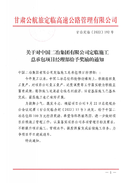 10月18日,甘肅公航旅定臨高速公路管理有限公司發(fā)布通報,對中國二冶定臨項目部能夠迎難而上,積極組織復(fù)工復(fù)產(chǎn)等工作進行表揚,并給予100萬元經(jīng)濟獎勵。
