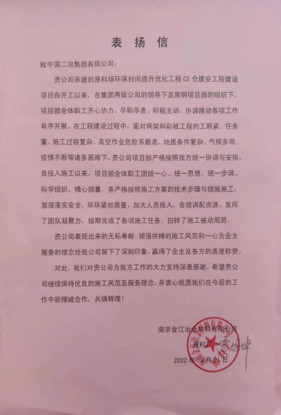 10月21日,中國二冶南鋼項目部收到來自業(yè)主單位南京金江冶金爐料有限公司原料廠的表揚信,對中國二冶冶金分公司南鋼項目部在承建的原料廠環(huán)保封閉提升優(yōu)化工程C2倉建安工程項目建設過程中講信譽、重合同、保履約給予表揚,同時對項目部的嚴格管理以及優(yōu)秀的工作態(tài)度表示贊賞。