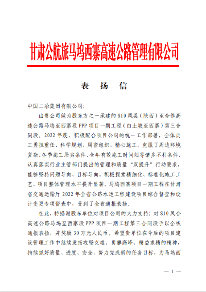 11月8日,甘肅公航旅馬塢西寨高速公路管理有限公司向中國二冶致表揚信,對中國二冶馬塢西寨高速公路項目積極探索精細(xì)化、標(biāo)準(zhǔn)化施工工藝,項目整體管理水平提升顯著等工作給予通報表揚,并給予30萬元經(jīng)濟獎勵。