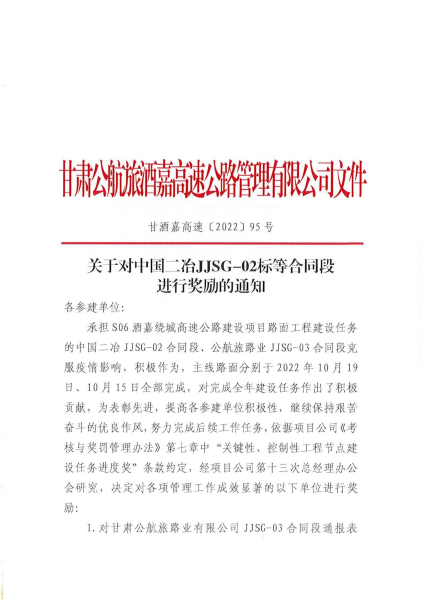 11月23日,甘肅公航旅酒嘉高速公路管理有限公司在酒嘉繞城高速公路項(xiàng)目全線發(fā)出通報(bào),對(duì)中國(guó)二冶酒嘉項(xiàng)目部在關(guān)鍵性、控制性工程節(jié)點(diǎn)的建設(shè)任務(wù)完成出色,在工程質(zhì)量、安全生產(chǎn)等方面的突出表現(xiàn)給予通報(bào)表?yè)P(yáng),并給予100萬(wàn)元經(jīng)濟(jì)獎(jiǎng)勵(lì)。