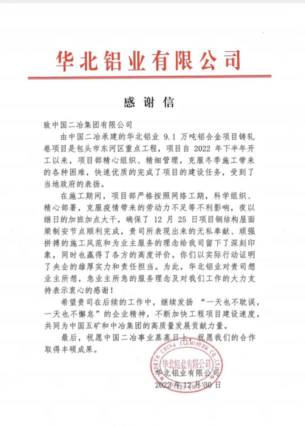 華北鋁業(yè)有限公司在信中指出,中國二冶在施工期間,嚴(yán)格按照網(wǎng)絡(luò)工期,科學(xué)組織、精心部署,克服疫情帶來的勞動(dòng)力不足等不利影響,夜以繼日加班加點(diǎn)大干,確保了12月25日項(xiàng)目鋼結(jié)構(gòu)屋面梁制安的順利結(jié)束,貴司所表現(xiàn)出來的無私奉獻(xiàn)、頑強(qiáng)拼搏的施工風(fēng)范和為業(yè)主服務(wù)的理念給我司留下了深刻印象,同時(shí)也贏得了各方的高度評(píng)價(jià)。你們以實(shí)際行動(dòng)證明了央企的雄厚實(shí)力和責(zé)任擔(dān)當(dāng)。