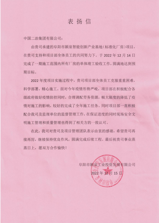 12月18日,中國二冶華東分公司承建的阜陽市潁泉智能創(chuàng)新產(chǎn)業(yè)基地(標(biāo)準(zhǔn)化廠房)項(xiàng)目部收到業(yè)主方阜陽市穎泉工業(yè)投資發(fā)展有限公司的表揚(yáng)信,對(duì)華東分公司阜陽項(xiàng)目部在阜陽市潁泉智能創(chuàng)新產(chǎn)業(yè)基地(標(biāo)準(zhǔn)化廠房)工程建設(shè)過程中,勇于面對(duì)各種困難、精心策劃、科學(xué)管理、全力以赴的工作態(tài)度表示贊許。
