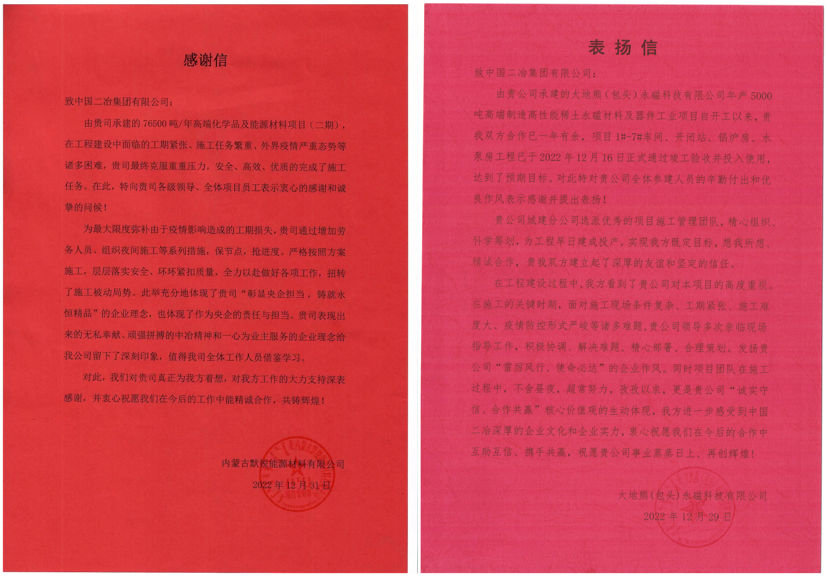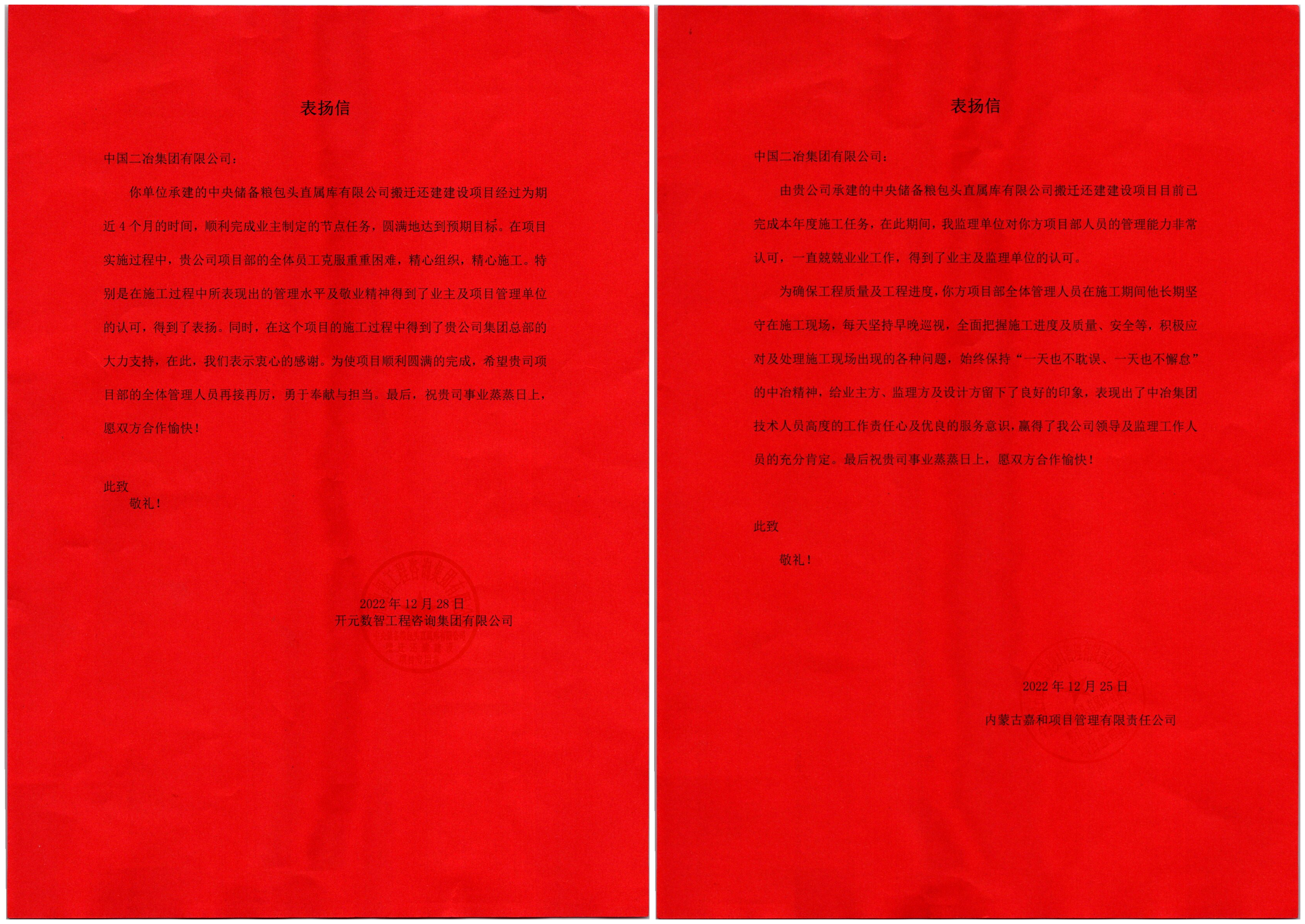 歲末年關,中國二冶承建的達旗默銳項目、大地熊項目、中儲糧項目接連收到業(yè)主及各方表揚信,對各項目克服難題順利推進工程建設,按計劃完成預期施工目標表示高度贊揚,對公司及參建團隊為總工期目標奠定的堅實基礎表示祝賀和感謝。