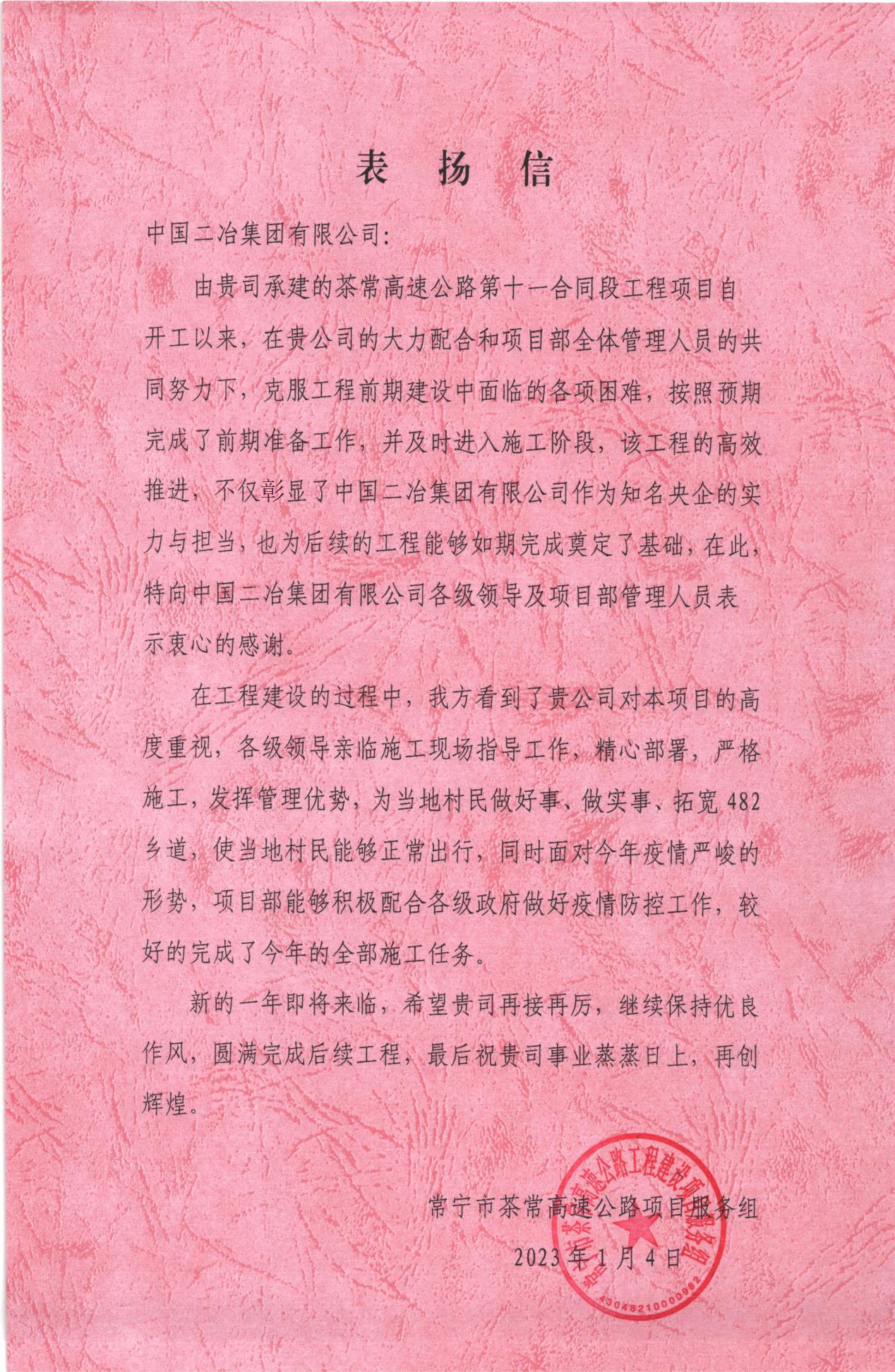 1月4日,中國二冶茶常高速公路第十一合同段項目部收到常寧市茶常高速公路項目服務(wù)組表揚信,對中國二冶的高度重視和大力支持表示感謝,對公司各級領(lǐng)導(dǎo)及項目部全體管理人員高效推進項目進度提出表揚。