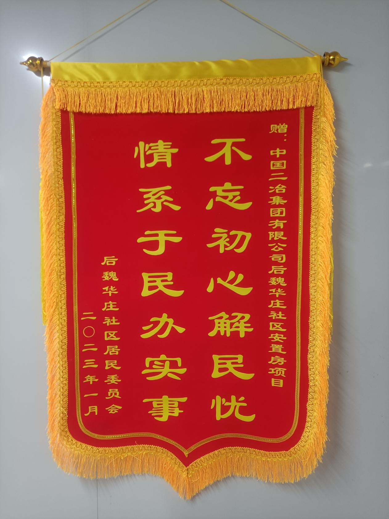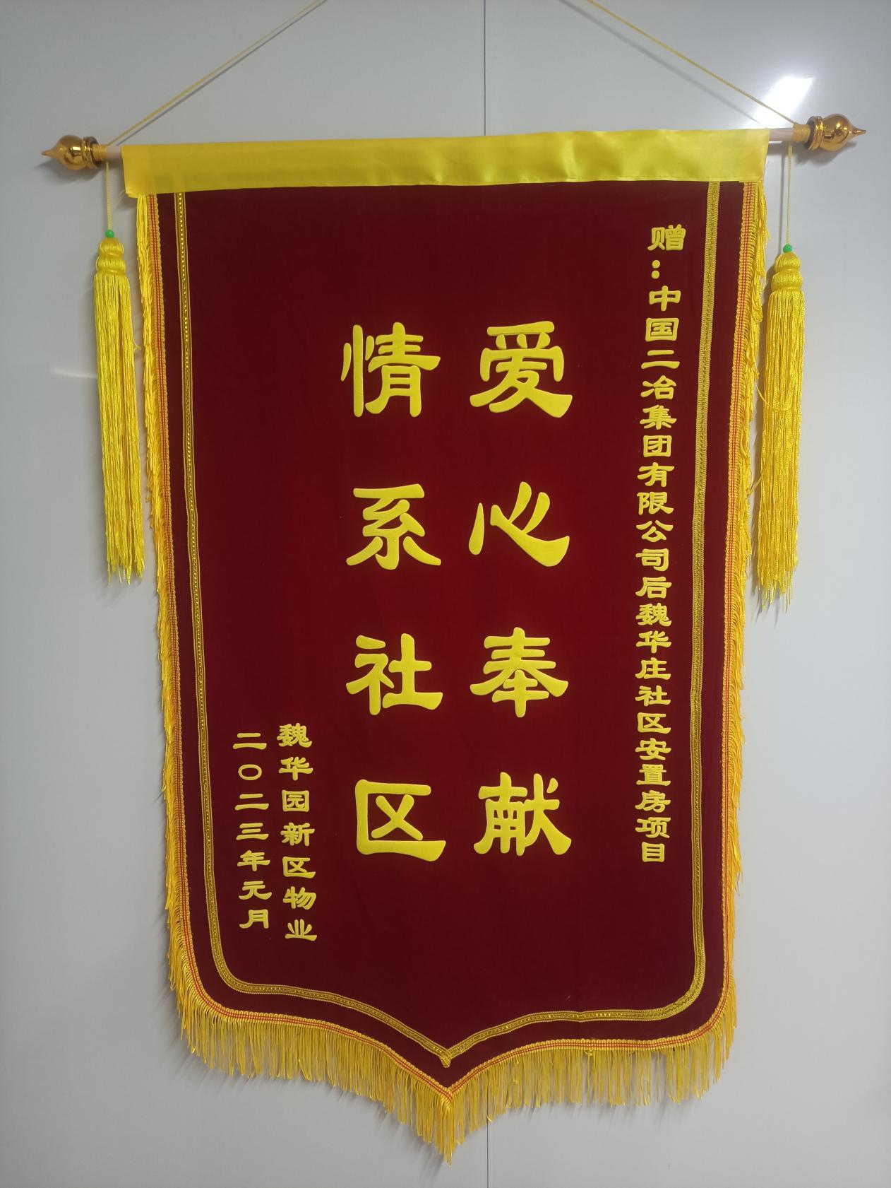 1月10日,中國(guó)二冶收到來自濟(jì)南后魏華莊社區(qū)居民委員、魏華國(guó)新區(qū)物業(yè)的兩面錦旗。一面印有“不忘初心解民憂,情系于民辦實(shí)事”、一面印有“愛心奉獻(xiàn),情系社區(qū)”,感謝中國(guó)二冶濟(jì)南后魏華莊房項(xiàng)目部在項(xiàng)目建設(shè)、疫情防控等工作中的突出貢獻(xiàn)。