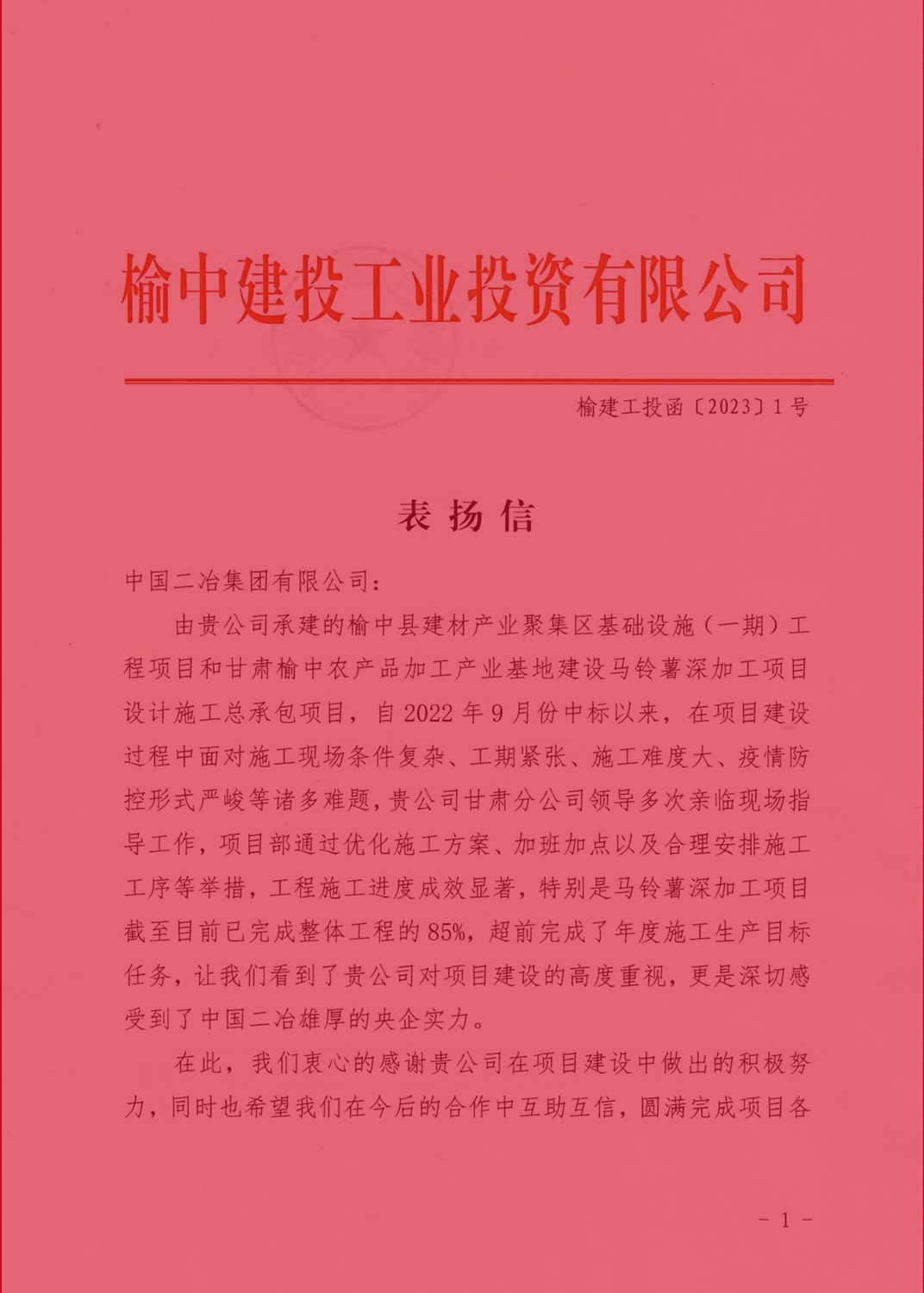 歲末年關,中國二冶承建的甘肅榆中縣建材產(chǎn)業(yè)聚集區(qū)基礎設施(一期)工程項目和甘肅榆中農(nóng)產(chǎn)品加工產(chǎn)業(yè)基地建設馬鈴薯深加工項目設計施工總承包項目、景禮高速公路項目部接連收到表揚信,來信對各項目部克服難題順利推進工程建設做出的積極努力表示感謝和肯定。