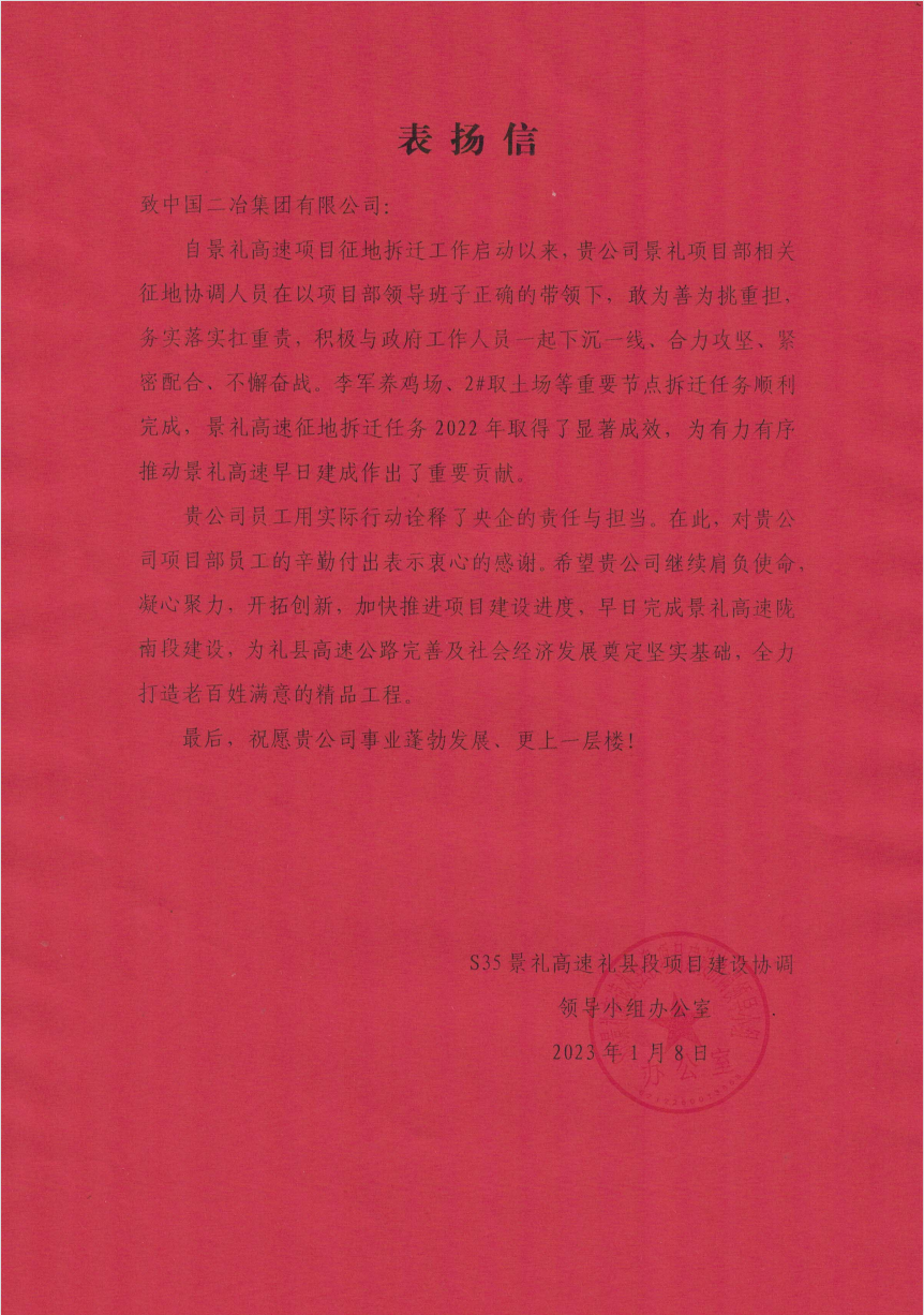 景禮高速公路項目部獲S35景禮高速禮縣段項目建設協(xié)調領導小組辦公室表揚信,信中表示,自景禮高建項目征地拆遷工作啟動以來,中國二冶景禮項目部相關征地協(xié)調人員在以項目部領導班子正確的帶領下,敢為善為挑重擔,務實落實扛重責,積極與政府工作人員一起下沉一線、合力攻堅、緊密配合、不懈奮戰(zhàn)。重要節(jié)點拆遷任務順利完成,景禮高速征地拆遷任務取得了顯著成效,為有力有序推動景禮高速早日建成作出了重要貢獻,中國二冶員工用實際行動詮釋了央企的責任與擔當。