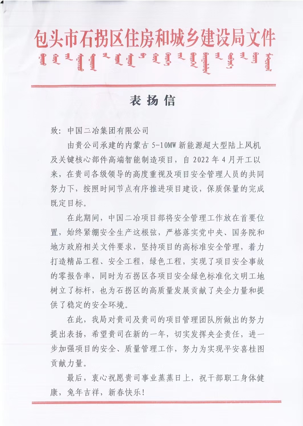 表揚信指出,由中國二冶承建的內(nèi)蒙古5-10MW新能源超大型陸上風(fēng)機及關(guān)鍵核心部件高端智能制造項目,自2022年4月開工以來,中國二冶項目部將安全管理工作放在首要位置,始終緊繃安全生產(chǎn)這根弦,嚴(yán)格落實黨中央、國務(wù)院和地方政府相關(guān)文件要求,堅持項目的高標(biāo)準(zhǔn)安全管理,著力打造精品工程、安全工程,綠色工程,實現(xiàn)了項目安全事故的零報告率,同時為石拐區(qū)各項目安全綠色標(biāo)準(zhǔn)化文明工地樹立了標(biāo)桿,也為石拐區(qū)的高質(zhì)量發(fā)展貢獻(xiàn)了央企力量和提供了穩(wěn)定的安全環(huán)境。