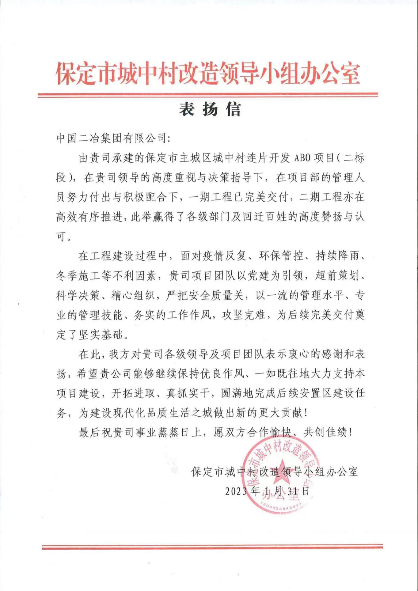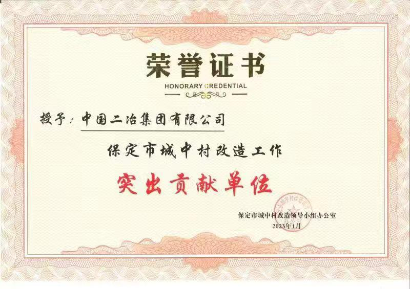 1月31日,中國二冶收到保定市城中村改造領(lǐng)導(dǎo)小組辦公室的表揚(yáng)信,并被授予保定市城中村改造工作突出貢獻(xiàn)單位。